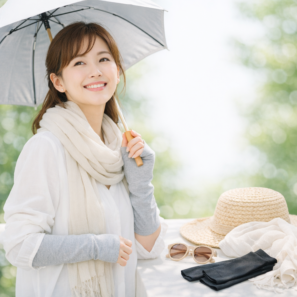 手の甲・腕・首まわりは、日傘や服だけでは守りきれない“焼けやすい部分”。 そこで役立つのが、アームカバーやストールなどの小物です。